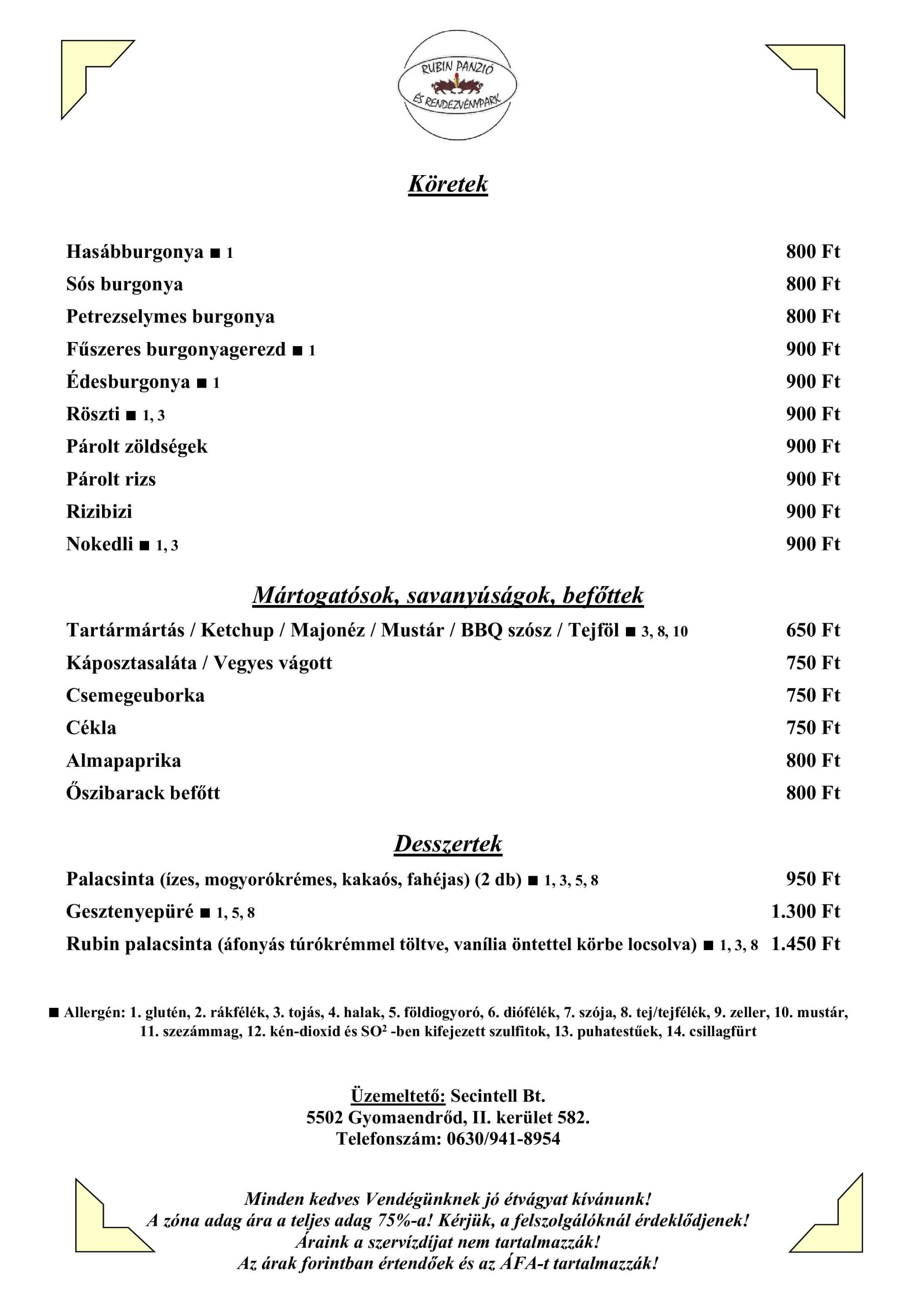 Étlapunkat évszaknak megfelelően frissítjük, módosítjuk, bízva benne, hogy ételeink között minden vendégünk talál kedvére valót. A vendéglőben vállaljuk családi, baráti, vagy céges rendezvények lebonyolítását.